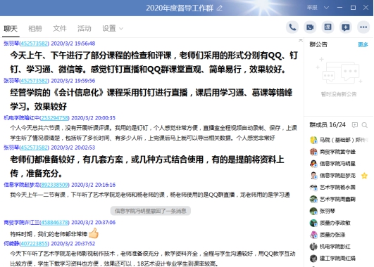 各“云端教室”中,授课教师充分运用钉钉、学习通、QQ群课堂等新媒体展开课程教学。教师备课充分,同学们配合积极,参与热情高,互动良好,到课率高,课堂学习氛围浓郁。