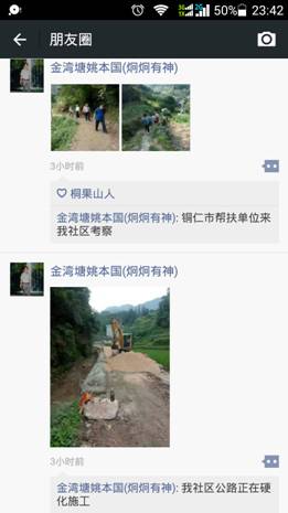 四是充分发挥微信的交流平台,及时传递脱贫攻坚政策和经验。铜仁电大包村干部宋友德同志,利用微信交流平台,及时向金湾塘社区支部书记姚本川、社区主任姚本国、驻村干部杜倩等同志,传递省、市脱贫攻坚政策及地方脱贫攻坚工作经验,其中“七一”期间共有19条,同时,经常性地与姚本川、姚本国、杜倩电话对接,及时了解金湾塘脱贫攻坚近况。