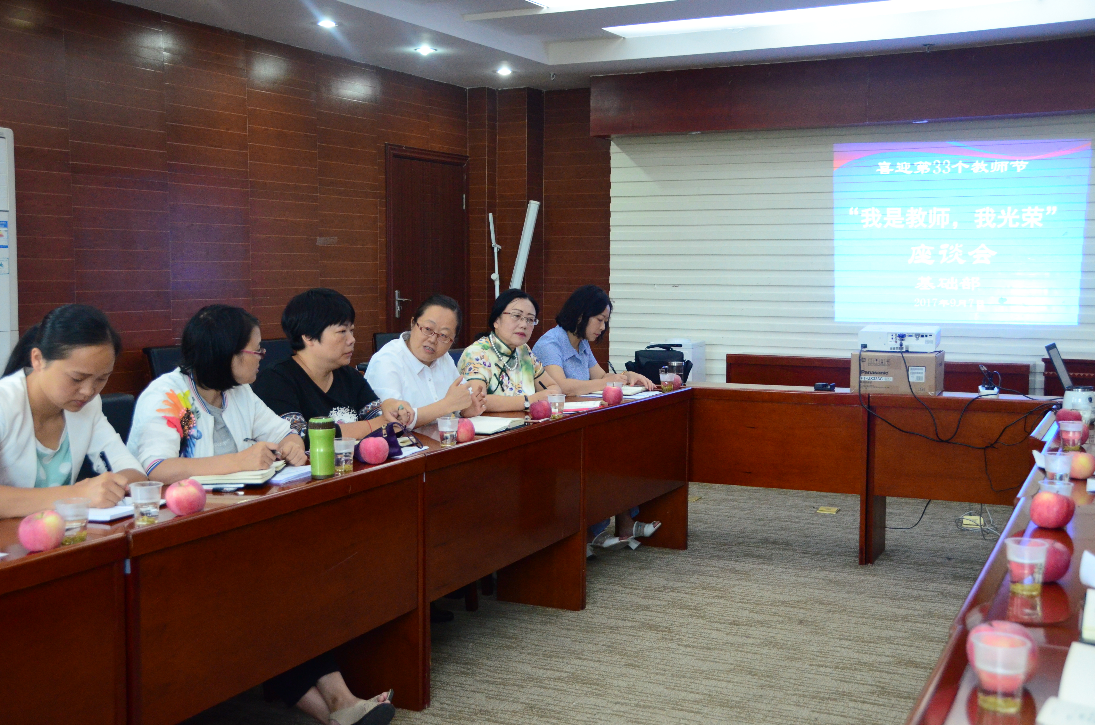 为了继承发扬“重师道、育栋梁”的优良传统,学习“勤钻研、乐教学”的育人模范,增强“精技艺、善创新”的教学能力,喜迎第三十三个教师节,9月7日下午2:00基础部(马列部)全体教师在行政楼5楼会议室召开“我是教师·我光荣”为主题的座谈会。会议由基础部(马列部)陈国敏主任主持,副校长李勤到座谈会对基础部(马列部)全体老师表达了节日慰问和祝福,并指出教师是一个阳光职业,责任重大,要求部门老师要做有教育情怀的教师,在学生德智体美教学中发挥积极、主动作用,不辜负党和人民的重托。陈国敏主任转达了学院党委书记邓惠宾、党委副书记郭万才基础部(马列部)教师的节日问候和美好祝愿。