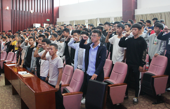 会场上学生举起右手宣读《中等职业学校学生公约》,并表示自觉养成良好的思想品质和行为习惯。