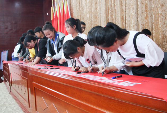 最后,同学们队列整齐、有序地走上主席台,情绪热烈,踊跃地提笔在《贵州职院中等职业技术学校学生公约》红色长条横幅上郑重地签署上自己的姓名。