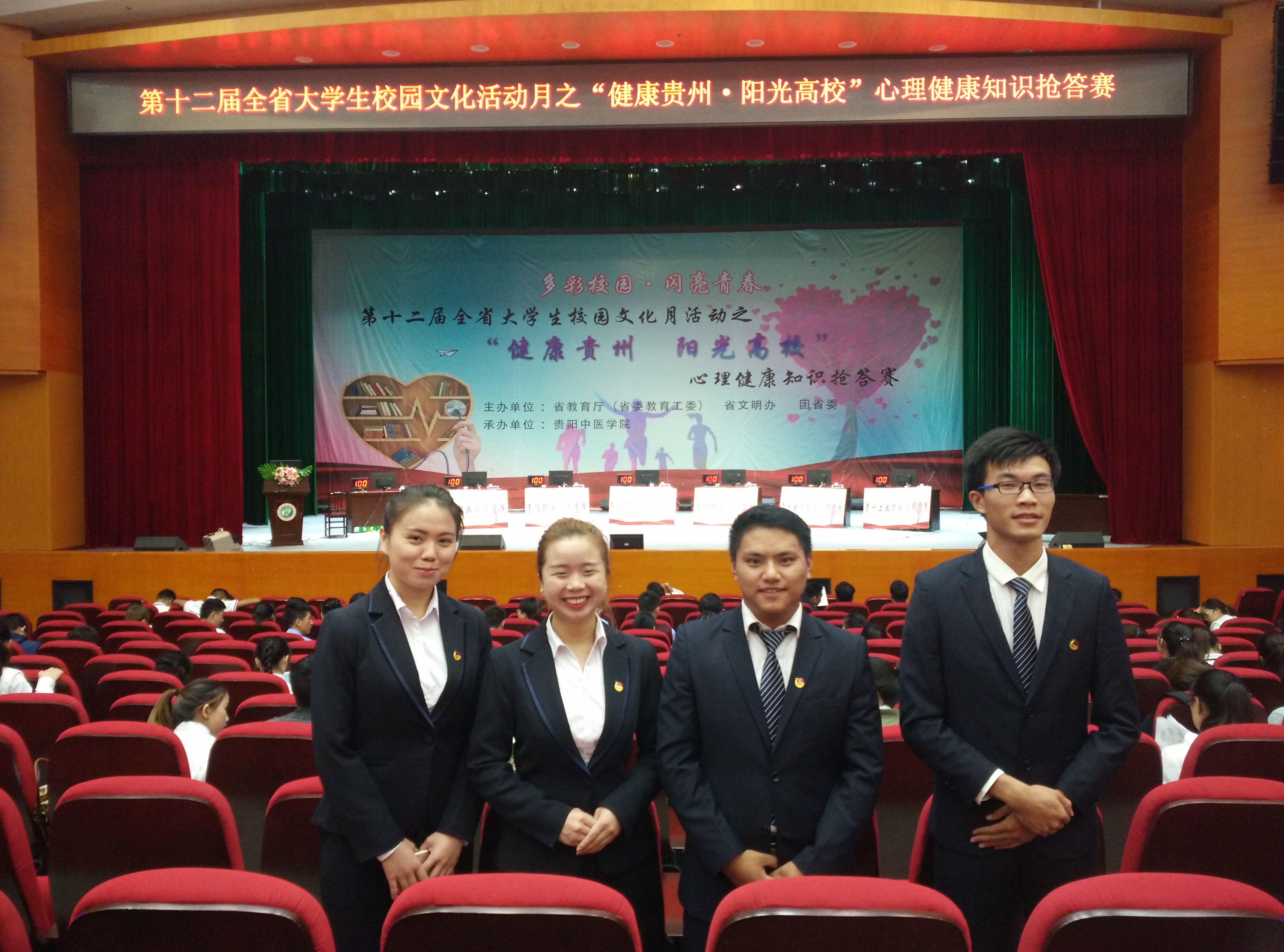 9月27日至29日,第十二届全省校园文化节之“健康贵州,阳光高校”全省大学生心理健康知识抢答赛在贵阳中医学院新校区举行。我校基础部蒋兴旺、郑传春两位老师带领来至经管学院工商161班的陈元同学、酒店管理161的蔡逸瑶同学、会计166班的王华江同学,以及来至商贸学院物流162班的周婷四名同学代表我校参加本次比赛。本次大赛旨在丰富大学生课余生活,帮助大学生普及心理健康知识,拓宽大学生知识面,树立心理健康意识,优化心理品质,增强心理调适能力和社会生活的适应能力,预防和缓解心理问题。