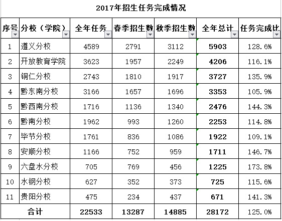今年开放教育春、秋两季招生招生共计28172人,超全年任务5639人,比去年增加3534人。全省11家分校(学院)全部超额完成全年招生任务。这些喜人成绩的取得,得益于学校党委行政的高度重视和措施有力、得益于全省电大招生工作者的不懈努力和通力协作、得益于继续教育学院从省引导办争取到550名“一村一名大学生计划”的全额财政补贴计划。