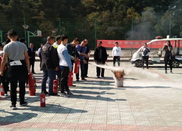 在进行灭火器材的使用培训前,保卫处罗文金处长向师生们详细讲解了灭火器材的灭火原理及正确使用方法,随后各师生、员工依次进行灭火器材的操作使用。