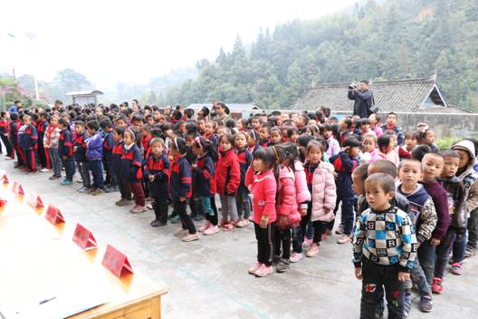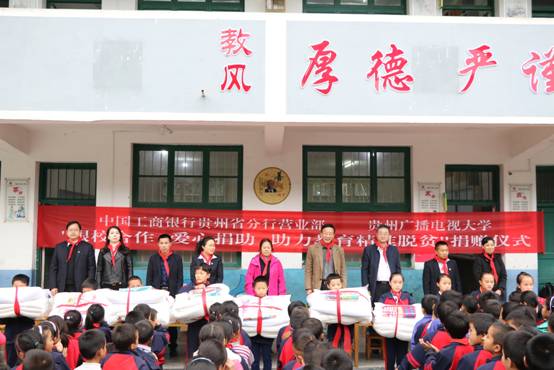 我校党委副书记郭万才、贵州省分行营业部机构业务部总经理吕超、贵阳贵溪支行行长罗竞、从江县政协副主席梁正秀、刚边乡党委书记潘勇、刚边乡乡长韦海桥莅临现场,与两所学校340名住校生共同见证了这一场爱心捐赠。