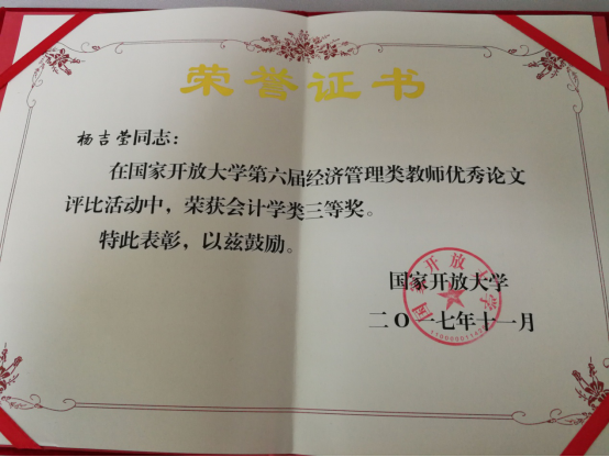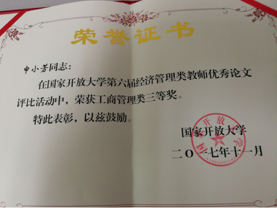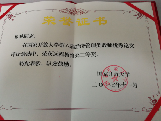 2017年11月,国家开放大学在本届论文评比活动中,组织了36位专家对全国286篇论文进行初审和终审,最终确定108篇论文获奖。远程教育教学部张艳、申小芳、杨吉莹三位教师的论文在本次评比活动中获奖,可喜可贺!