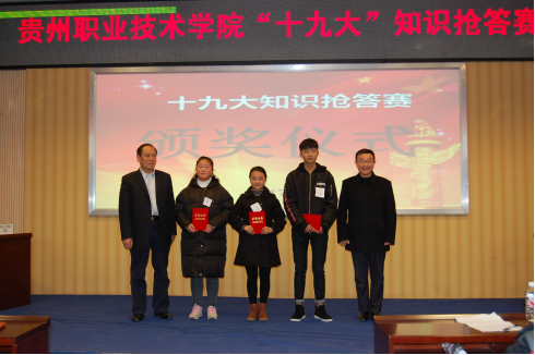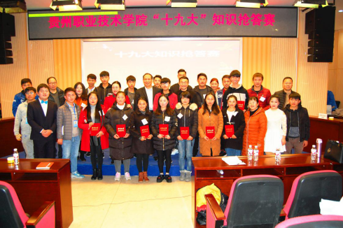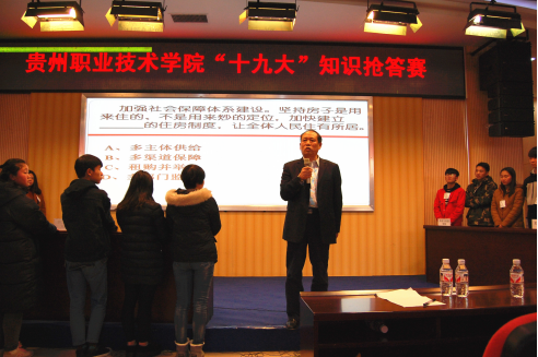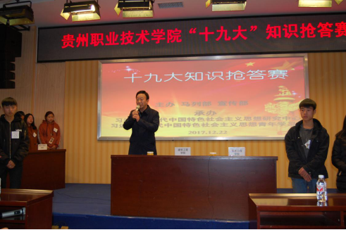 2107年12月22日13:20---15:10在贵州职院图书馆报告厅,贵州职院马列部、宣传部携手贵州职院“习近平新时代中国特色社会主义思想研究中心”、“习近平新时代中国特色社会主义思想青年学习社”主办了一场别开生面的“党的十九大精神知识抢答赛”。学校党委书记邓惠宾、校长李皖、党委副书记郭万才参加了抢答赛。