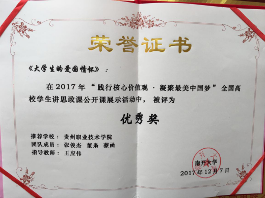 为深入贯彻落实全国高校思想政治工作会议精神,扎实开展“高校思政课教学质量年”专项工作,提升思政课教学的亲和力和针对性,充分发挥思政课在大学生思想政治教育中的主渠道作用,切实增强学生对思政课的获得感,由教育部社科司指导,南开大学马克思主义学院承办了全国高校大学生讲思政课公开课展示活动。据南开大学官网公示,活动自2017年6月启动以来,经过高校展示、省级展示等环节,共接收各省级教育行政部门和全国重点马院推荐作品共97项。经组织专家和学生评委对参赛作品进行打分,我校马列部组织推送的“大学生的爱国情怀”获得优秀奖。