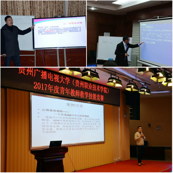 贵州广播电视大学(贵州职业技术学院)2017年度青年教师教学技能竞赛决赛在云潭南路校区顺利完成。2017年12月29日,由教务处、教师工作处和工会共同组织的青年教师教学技能竞赛决赛在学校领导高度重视和各二级学院(部)的积极参与下,分人文社会科学组、自然科学基础学科组、自然科学应用学科组同时在图书馆报告厅、行政楼五楼会议室和九楼会议室进行。