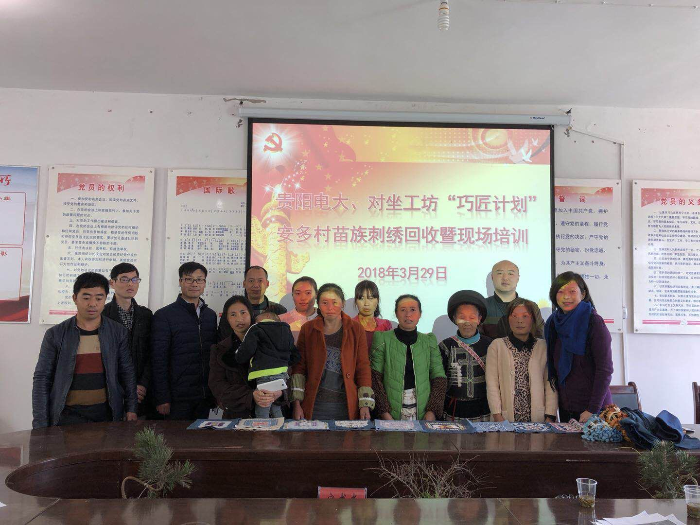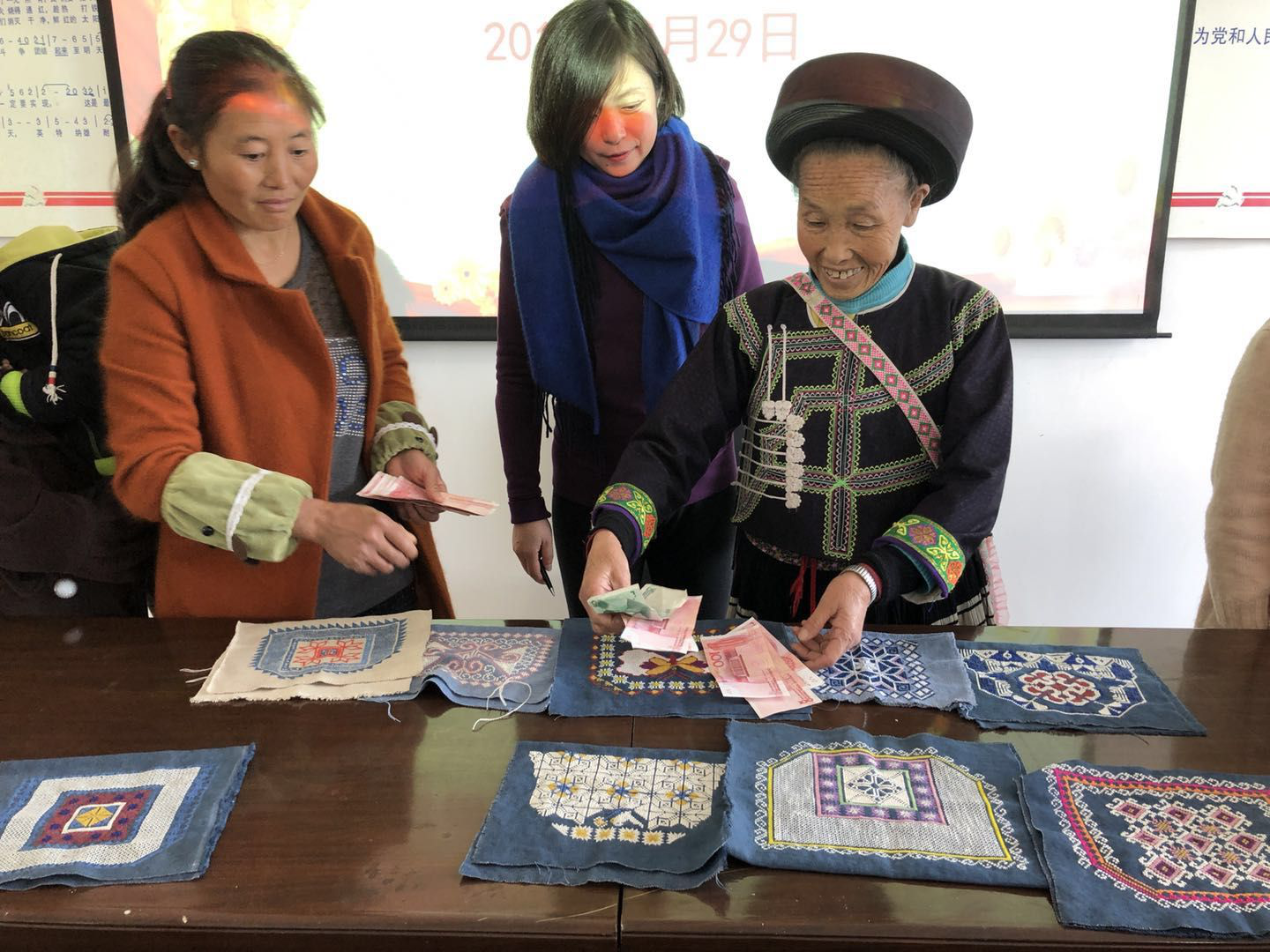经过前期一段时间绣娘们不断的努力学习和积极的探索尝试,她们的辛勤付出终于得到了回报。在贵阳市电大的大力支持下,依托贵阳市社区教育安多村刺绣蜡染复建项目,驻村干部积极协调联系,3月29日上午,“对坐工坊”负责人王燕达一行到安多村,对前期的苗绣产品进行点评和回收,同时对下一批的绣品进行了安排并对新的绣法进行了培训。