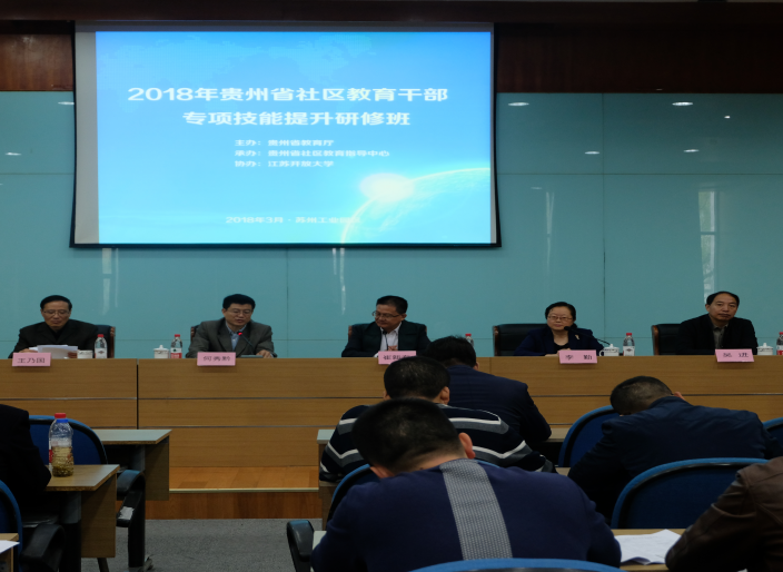 开班仪式由贵州广播电视大学副校长李勤主持,贵州省教育厅副厅长级督学、省委教育工委委员何秀黔,江苏开放大学校长崔新有出席开班仪式并讲话。出席开班仪式的还有江苏开放大学副校长吴进、社会教育处处长钱旭初,苏州工业园区社区学院院长王乃国,中国成人教育协会农专委秘书长姜明房及贵州省教育厅职称处、贵州省社区教育指导中心相关工作人员等。