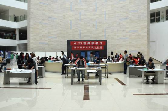 活动之五书法现场大比拼。4月23日中午,由图书馆、团委、关工委共同主办,学生社团知彩书友会、青年志愿者协会协办的“第五届书法现场大比拼”如期在图书馆一楼大厅举行。各学院(部门)师生积极参与,在比赛现场一展才华。李勤副校长亲临现场观看比赛。关工委孙鲁痕教授、苏起龙副教授应邀点评参赛作品并评奖。