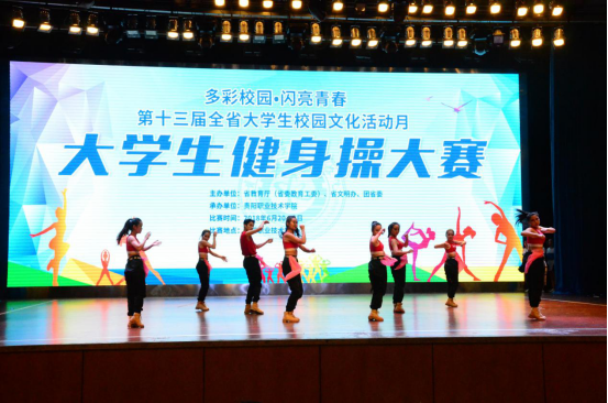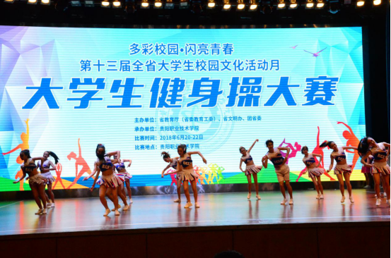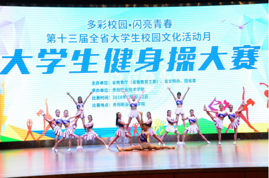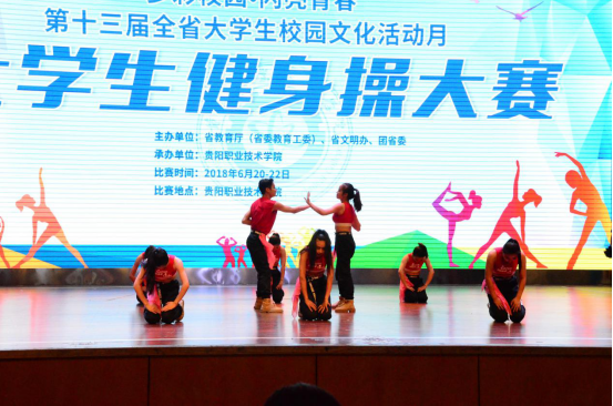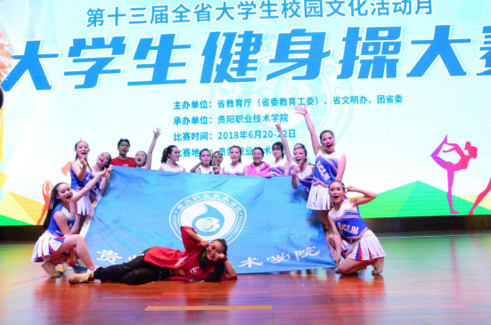 为充分展示当代大学生积极向上的精神风貌,丰富全省大学校园文化生活,由贵州省教育厅(省委教育工委)、省文明办、团省委联合主办的“多彩校园·闪亮青春”第十三届全省大学生校园文化活动月大学生健身操大赛于6月20至6月22日,在贵阳职业技术学院举行,我校健美操队荣获高职高专组第一名。