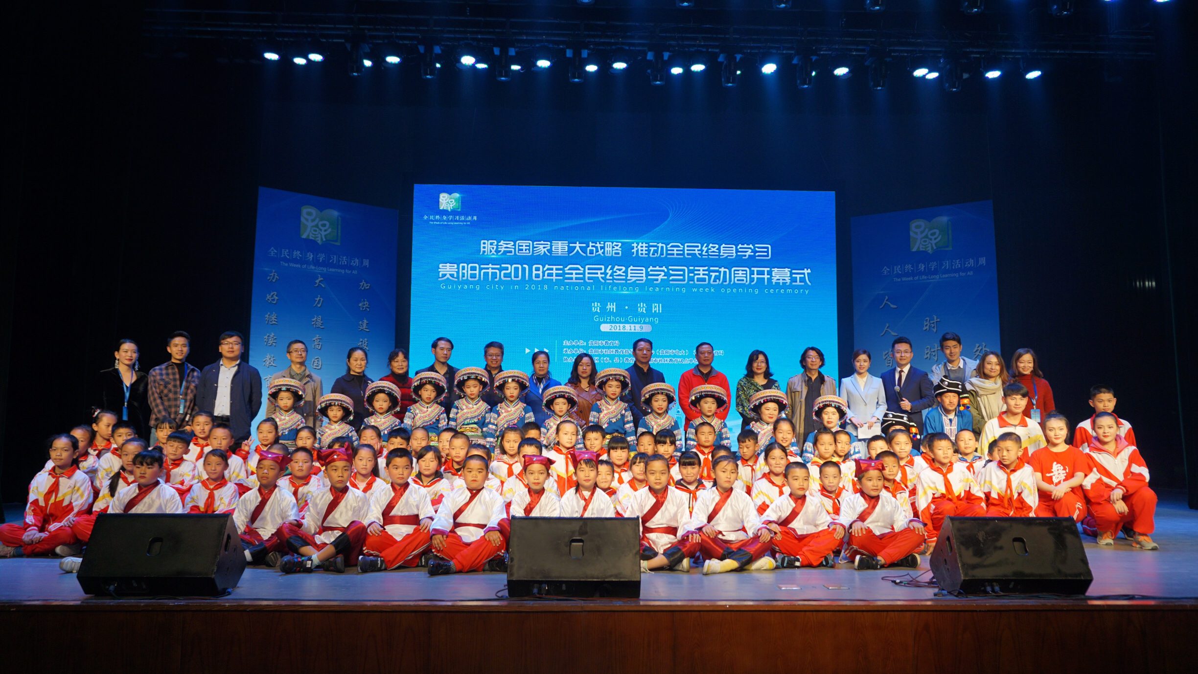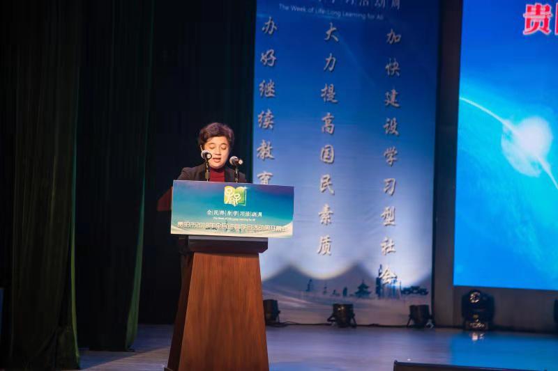 11月9日下午2点,贵阳市2018年全民终身学习活动周开幕式在花溪区孔学堂阳明大讲堂隆重举行。本次活动周以“服务国家重大战略,推动全民终身学习”为主题,由贵阳市教育局主办,贵阳市社区教育指导服务中心(贵阳市电大),花溪区教育承办,各区、市、县教育局、各社区教育试点单位协办。开幕式由贵阳市社区教育指导委员会办公室主任、贵阳电大党总支书记、校长田芳主持。省教育厅职称教处张禄海老师,市委教育工委副书记郭琳,共青团市委副书记蒋娟娟,市民政局副局长郑彪,贵阳市体育局副局长杨海,贵阳市委离退休干部工作局副局长杨志军,市妇联儿童部部长杨殷俊,贵阳市文广局调研员白陈新,贵阳市人社局副调研员吴剑辉,贵阳市委群工委研究室主任申时进,花溪区委常委,统战部长禄竹,乌当区副区长胡红,清镇市常务副市长唐樾,修文县常务副县长廖勇,贵阳市老年大学副校长田钢,贵阳市盲聋哑学校校长但琪琳,孔学堂文化传播中心开发部部长王雄出席了开幕式,各区(市、县)教育局、文明办、妇联分管领导,各区(市、县)教育关工委秘书长、各区(市、县)社区教育指导服务中心分管领导及具体负责人、市社区教育试点单位负责人、贵阳市2018年百姓学习之星、终身学习品牌项目获奖单位及个人,贵阳市首批市民学习体验基地代表、各支持单位、公益组织代表、参加演出演员、教师、学生、社区居民代表、媒体代表近500人参加。