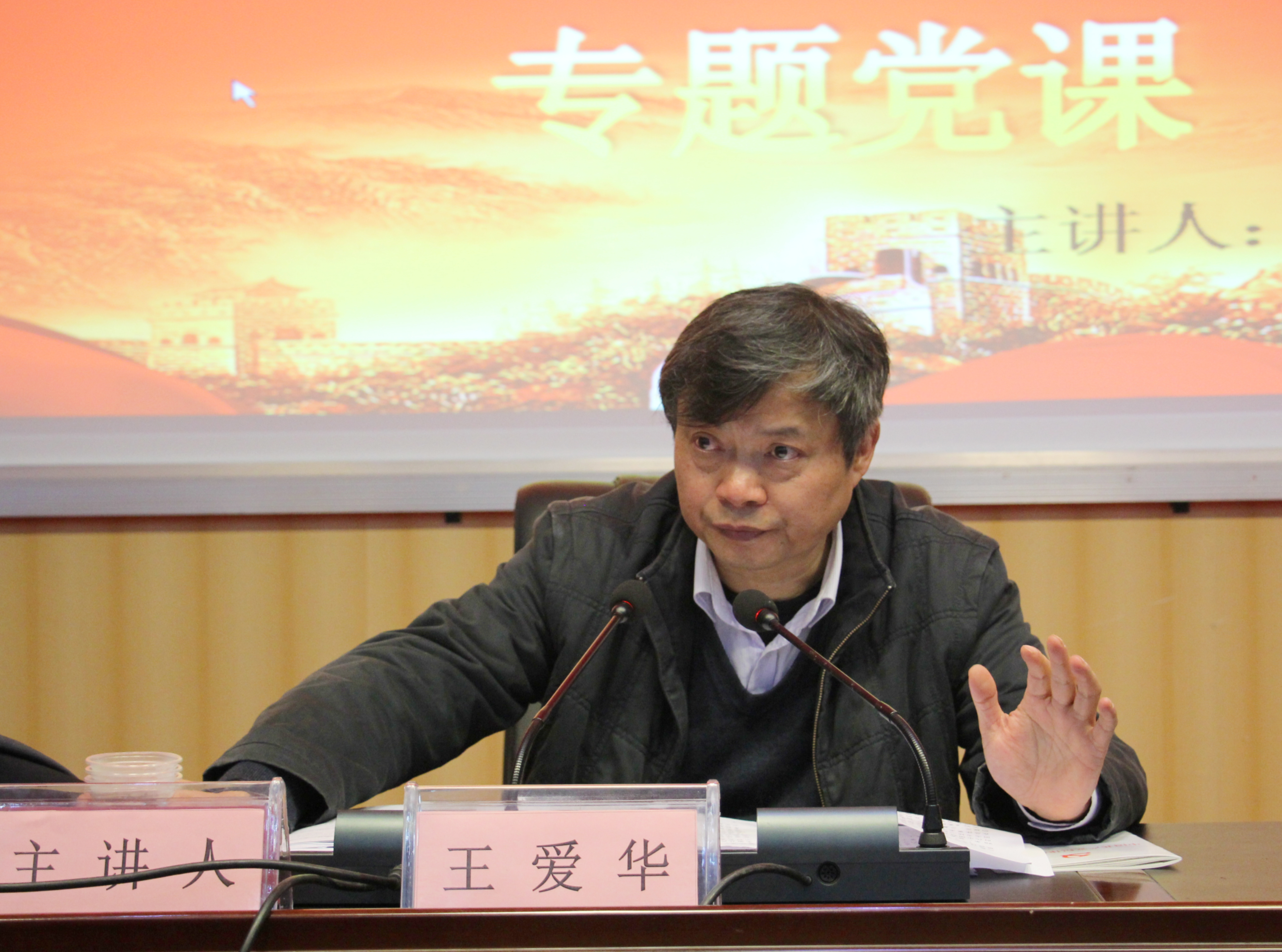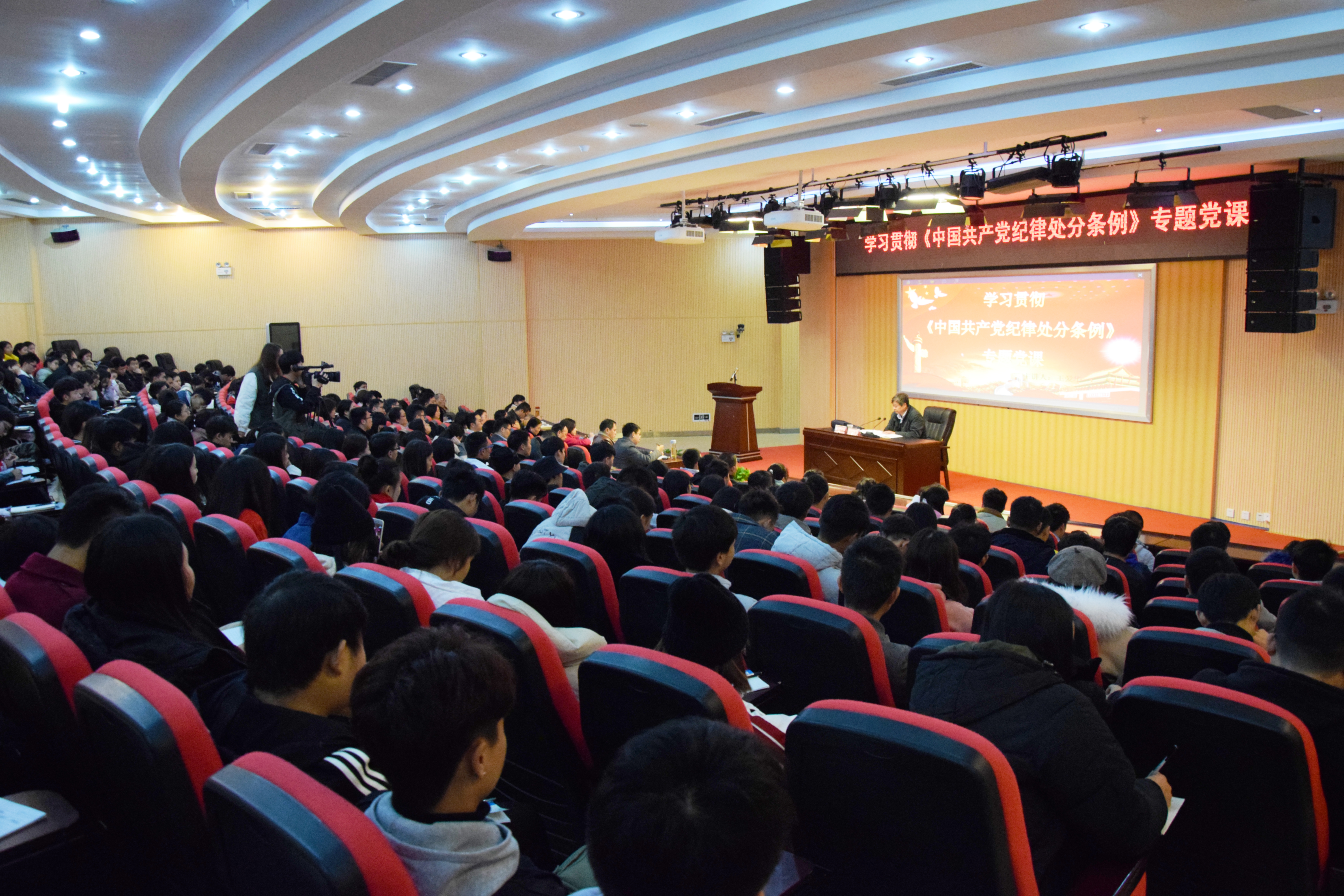 王爱华书记首先向与会师生介绍了《中国共产党纪律处分条例》修订的重大意义及《中国共产党纪律处分条例》的主要内容。从“一个指导”、“两个坚决维护”、“三个重点”、“四个意识”、“四种形态”、“五处纪法衔接”、“六个从重加重”、“七个有之”、“八种典型违纪行为”等方面为大家详细介绍了新修订的《中国共产党纪律处分条例》,并结合具体案例对有关条款进行了说明。