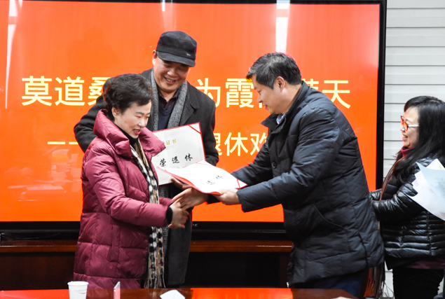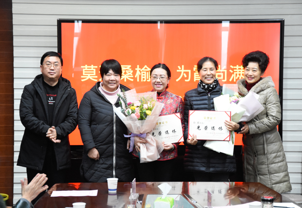 校领导为光荣退休的14名教职工颁发了退休证书,同事们为他们敬献了鲜花。