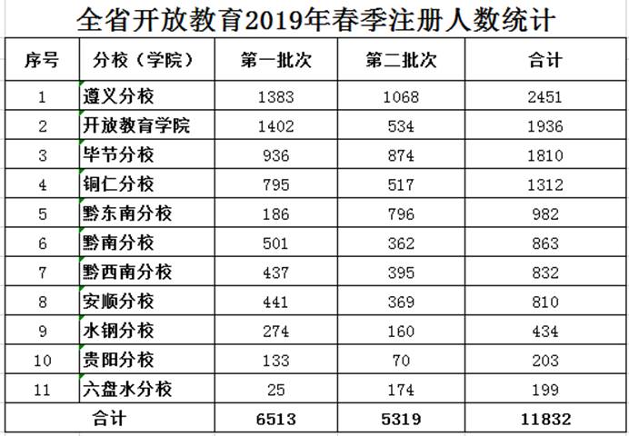 日前,随着国家开放大学第二批次招生资格校验完成,我校历时2个多月的开放教育2019年春季招生工作全面结束,本季招生共注册11832人,其中第一批次6513人,第二批次5319人,与去年同期相比,增加741人,增幅为6.7%。各分校(学院)具体招生注册人数如下: