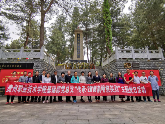 今年是新中国成立70周年,也是《中华人民共和国英雄烈士保护法》颁布实施一周年。为永远铭记为民族独立、人民解放和国家富强、人民幸福作出巨大牺牲的英雄烈士,努力营造传承英烈精神、奋进新时代的良好氛围,2019年4月23日中午,基础部党总支全体党员来到位于观山湖区朱昌镇百花湖旁的烈士陵园开展“传承∙2019清明祭英烈”主题党日活动,全体党员齐声诵读入党誓词,满怀虔诚之心缅怀革命先烈。