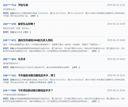 6月17至7月2日,由贵州省招生考试院、多彩贵州网联合主办的“2019年贵州高考网博会”(http://gzgk.gog.cn/)全面开启答疑模式,全国200多所院校的招生老师参加了此次活动。我校招就中心安排专人负责此次线上集中答疑,为广大学生及家长就关心的各类问题作出解答,此次答疑参与人数近500人,回答各类问题近千个。