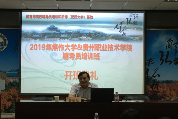 7月9日,贵州广播电视大学(贵州职业技术学院)辅导员骨干专题研修班在武汉大学马克思主义学院M301报告厅举行开班仪式,教育部高校辅导员培训和研修武汉大学基地主任、原武汉大学党委副书记、中央马工程首席专家骆郁廷、武汉大学辅导员基地工作人员和我校42名辅导员、学生工作者参加开班仪式。