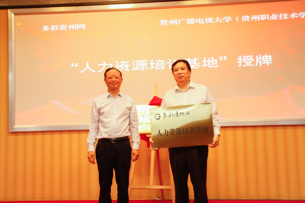多彩贵州网党委书记、董事长陈麟为人力资源培训基地授牌,贵州广播电视大学(贵州职业技术学院)副校长钱庆生接牌。