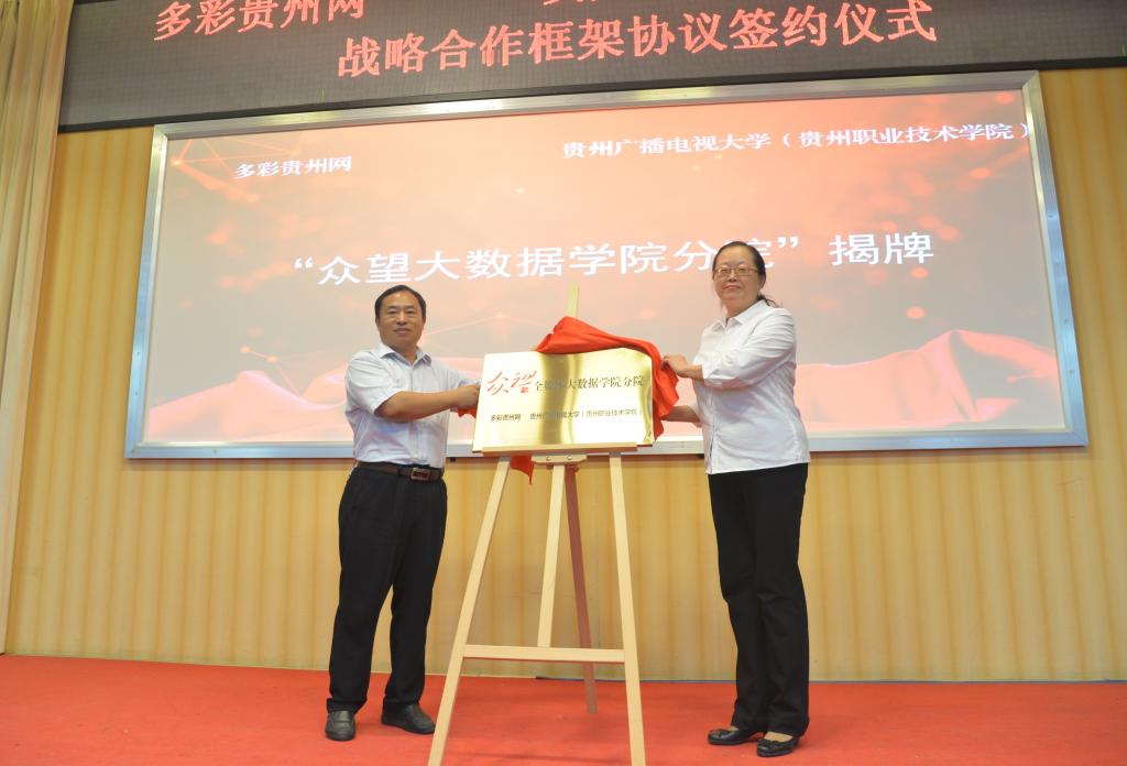贵州广播电视大学(贵州职业技术学院)副校长李勤与多彩贵州网党委副书记张云泓共同为众望大数据学院分院揭牌。