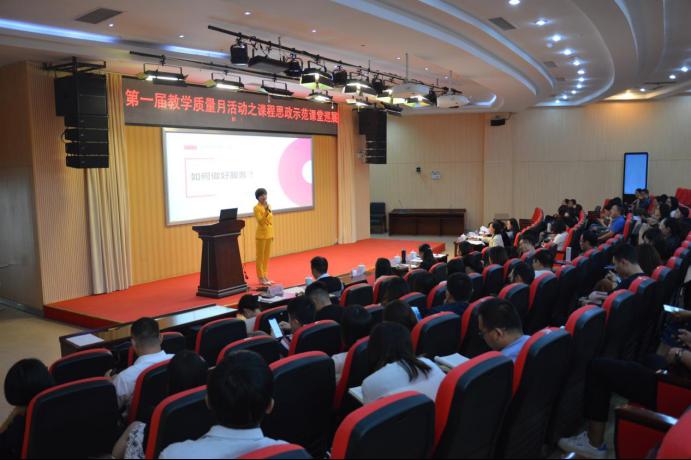 为了深入贯彻落实党的十九大精神和习近平新时代中国特色社会主义思想,喜迎中华人民共和国成立70周年,营造崇尚尊师重教的氛围和良好的教风学风环境,加快培养知识型、技能型、创新型的人才,围绕立德树人的根本任务,推进学校内涵式发展,提升人才培养质量和育人水平,按照《贵州广播电视大学(贵州职业技术学院)教学质量提升“领航计划”培养建设工程实施方案(试行)》文件要求,学校决定开展第一届“教学质量活动月”活动。2019年9月30日,我校第一届教学质量月活动之课程思政示范课堂巡展在图书馆二楼学术报告厅成功开展。