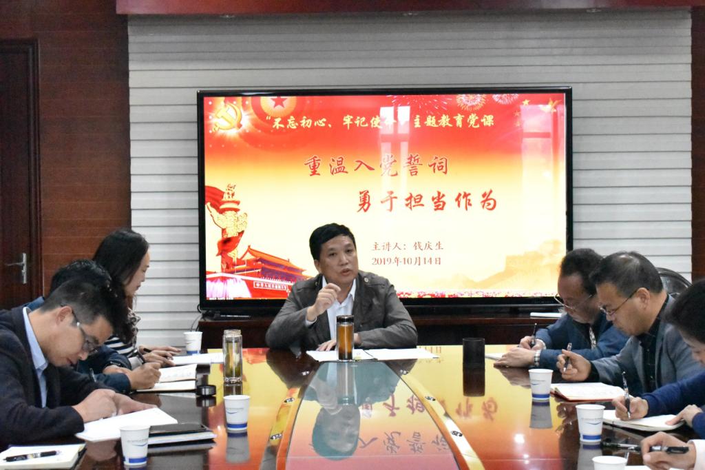 根据学校《关于印发〈中共贵州广播电视大学(贵州职业技术学院)委员会“不忘初心、牢记使命”主题教育实施方案〉的通知》要求,10月14日上午,钱庆生副校长以《重温入党誓词,勇于担当作为》为题,在云潭南路校区行政楼六楼会议室为分管部门及八鸽岩校区党总支党员干部上专题党课。
