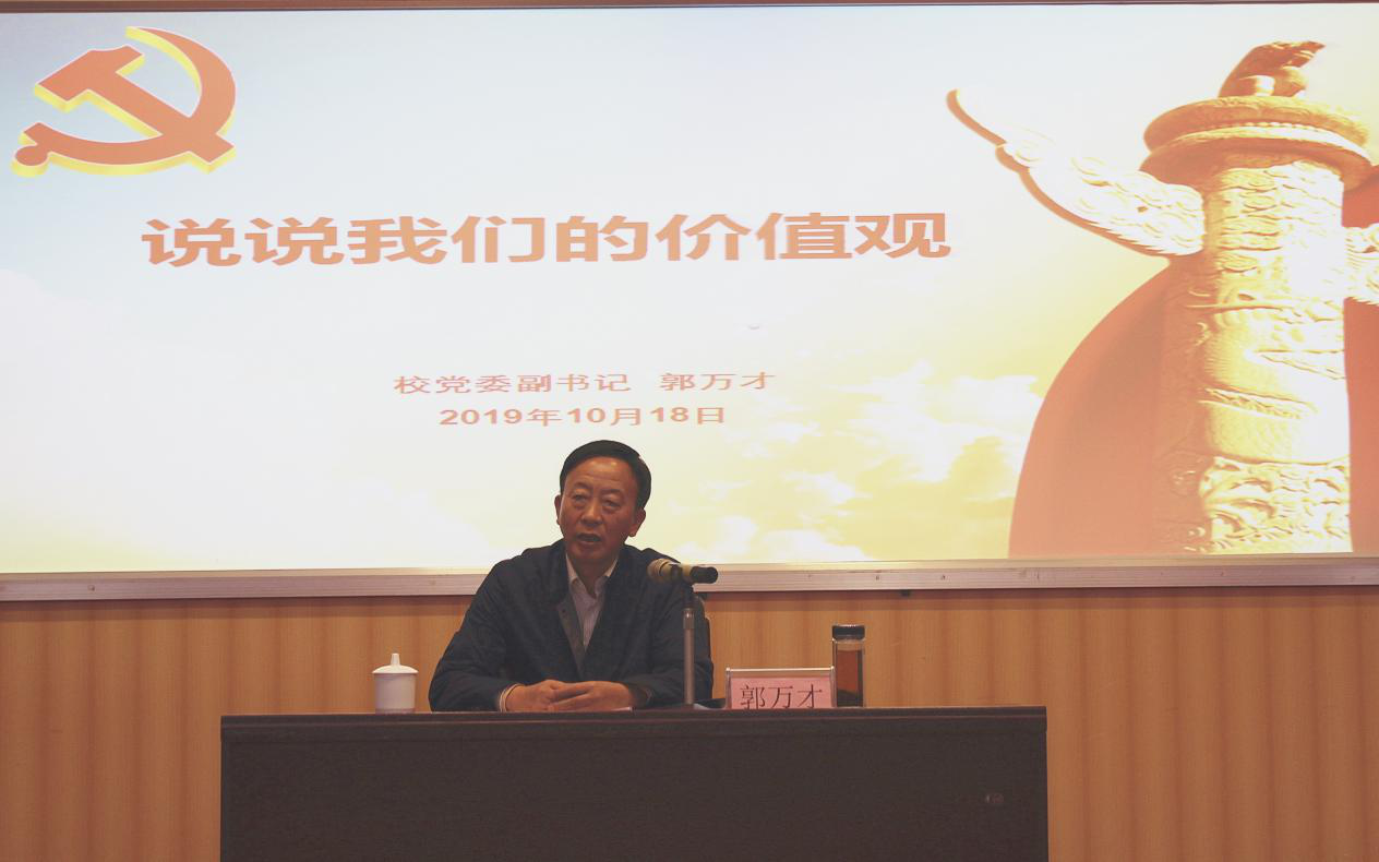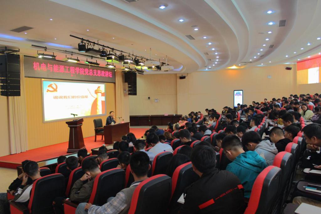 2019年10月18日下午,校党委副书记郭万才同志在图书馆二楼报告厅为机电与能源工程学院全体党员教师和学院各团支部、学生干部代表讲授了题为《说说我们的价值观》的主题思政课。本次思政课由机电与能源工程学院党总支副书记邓咏梅同志主持。