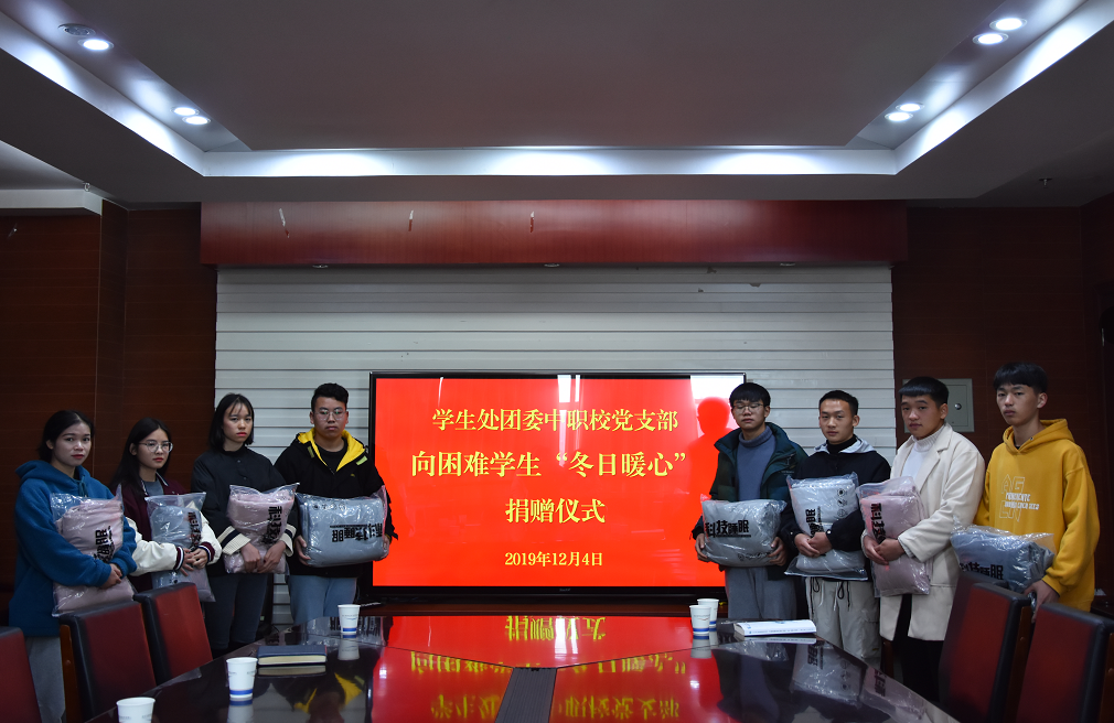 为深入开展“不忘初心、牢记使命”主题教育,切实解决学校精准扶贫学生及生活困难学生在学习、生活上的困扰,体现学校党委对困难学生的关心关爱,助力决胜脱贫攻坚,学生处团委中职校党支部于2019年12月4日举行向困难学生“冬日暖心”捐赠仪式。支部全体党员同志及24名受捐赠学生代表出席捐赠仪式。学校党委书记王爱华同志以普通党员身份参加仪式。