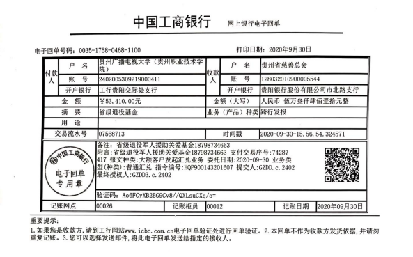 截止9月30日,共收到463名教职工捐款53410元,善款已按要求汇至贵州省慈善总会指定账号。